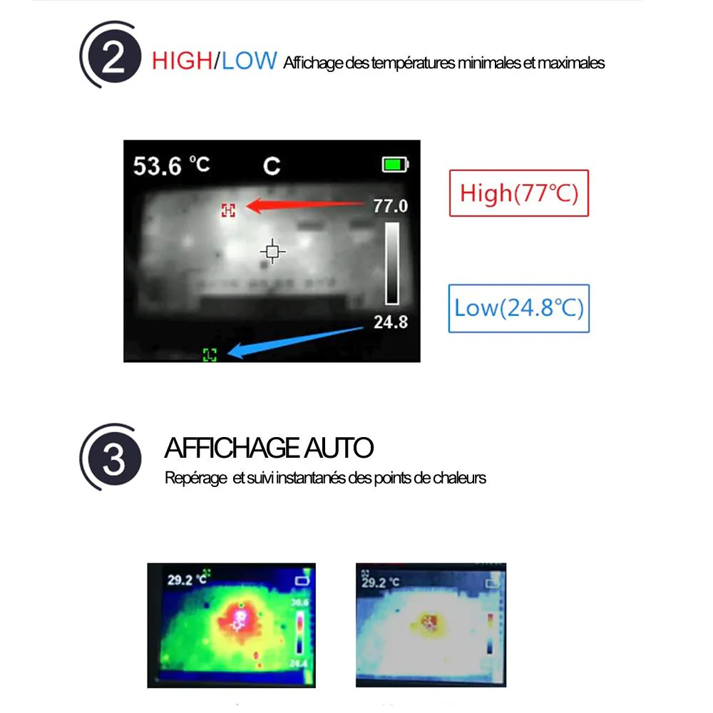 Profitez des avantages d’une véritable caméra d’imagerie thermique qui loge dans une poche de pantalon et affiche les températures minimales et maximales de la scène en capturée (pour les températures comprises entre -10 et 400°C.