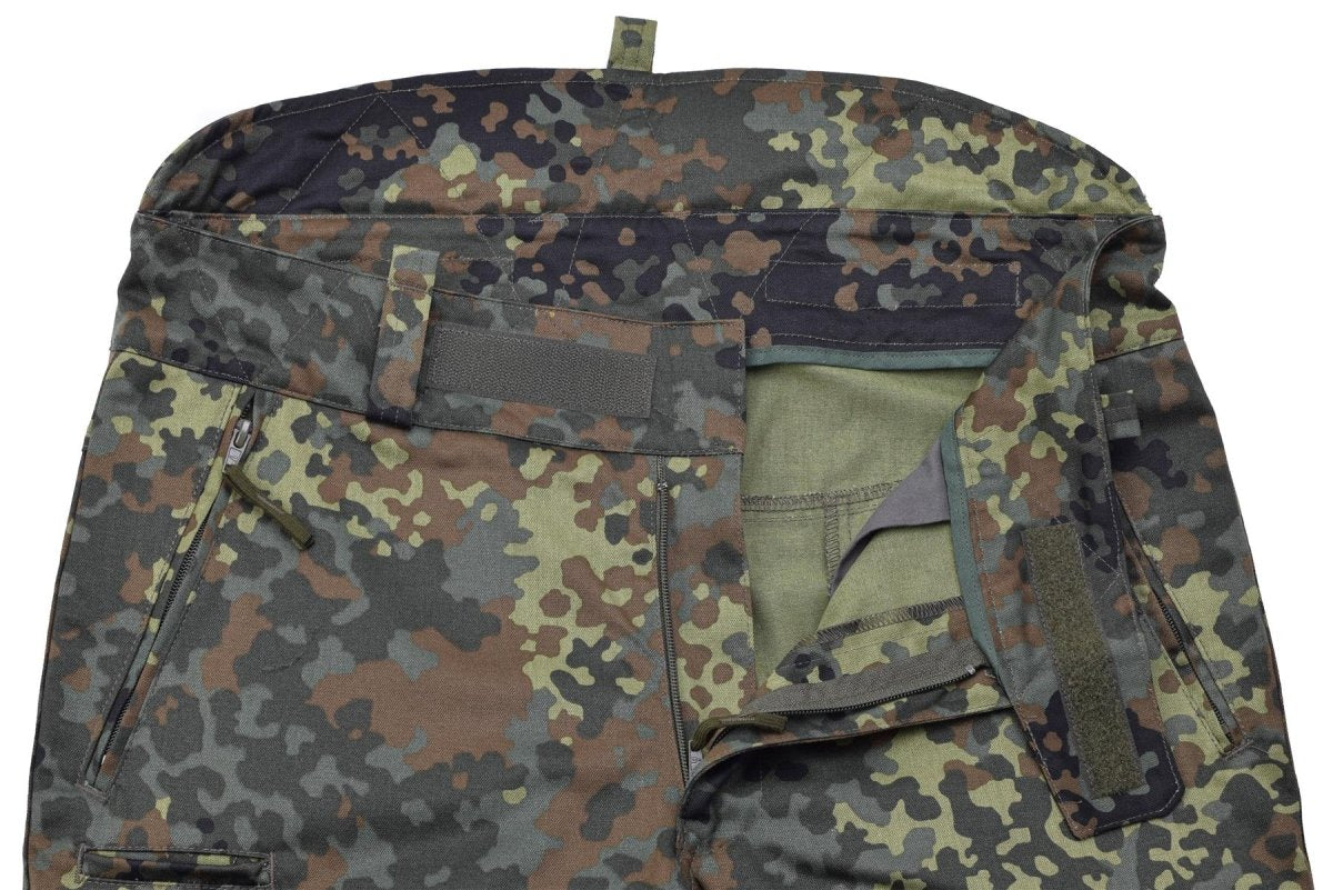 - Le pantalon se ferme avec une fermeture à glissière et présente un motif de camouflage flecktarn distinctif, assurant une dissimulation optimale dans divers environnements extérieurs. Ces caractéristiques rendent le pantalon idéal aussi bien pour les missions tactiques que pour les aventures en plein air. Le matériau ripstop durable résiste aux conditions difficiles, ce qui en fait un choix fiable pour toute activité exigeante.