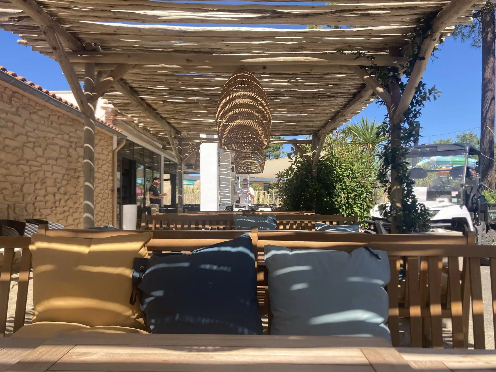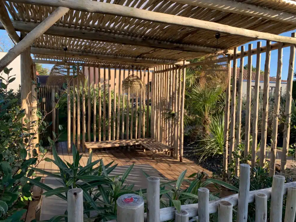 La pergola Nosy-Bé est fabriquée en eucalyptus. Cette essence, très résistante, ne nécessite aucun entretien. Ses formes irrégulières et son blanchiment au fil du temps qui lui donnent un aspect de bois flotté, font toute son originalité.